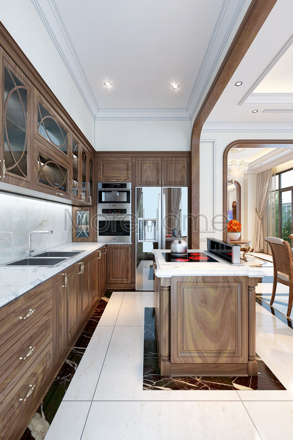 Bàn bếp được ốp đá grante màu trắng tạo sự thanh thoát cho không gian bếp. Bộ bàn bếp, ốp bếp sử dụng đá nhân tạo để tôn nên khoongg ian thật ấm cúng, hạnh phúc và sự thành đạt của gia đình.