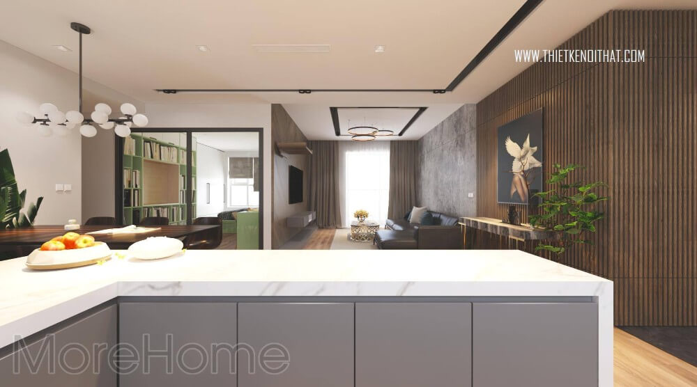 Loại đá sử dụng: Đá nhân tạo Greylac; Thi công ốp tường phòng khách sử dụng đá tự nhiên MoreStone