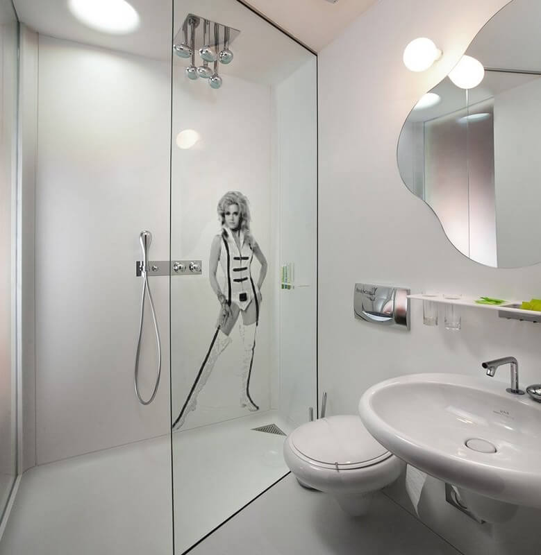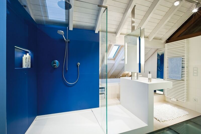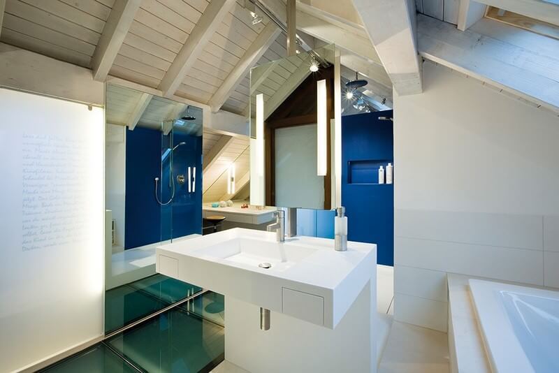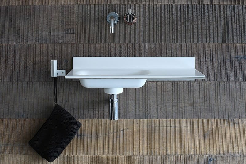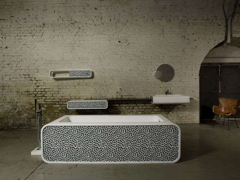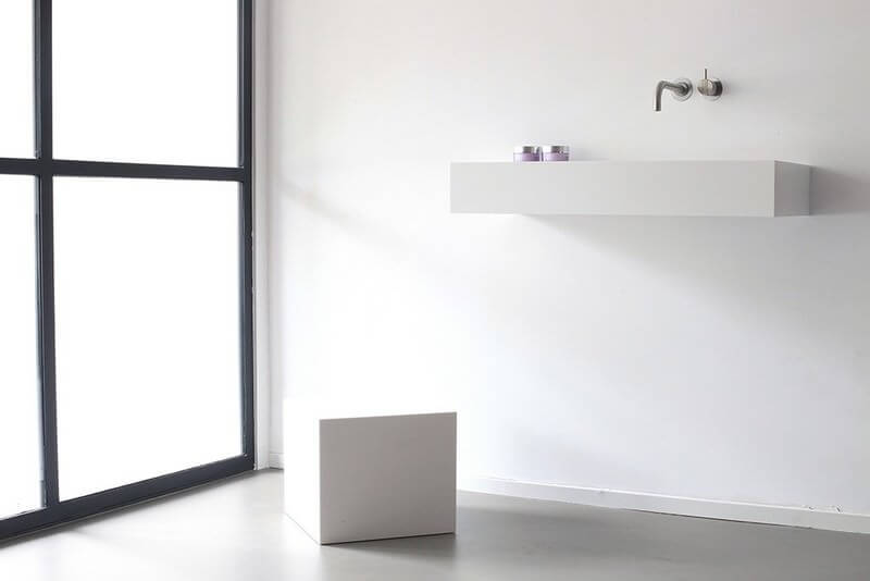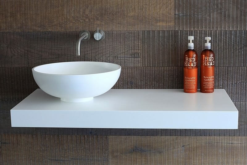 ứng dụng của đá nhân tạo hi-macs mã màu S028 trong phòng tắm: được sử dụng làm bồn tắm, mặt lavabo, ốp tường