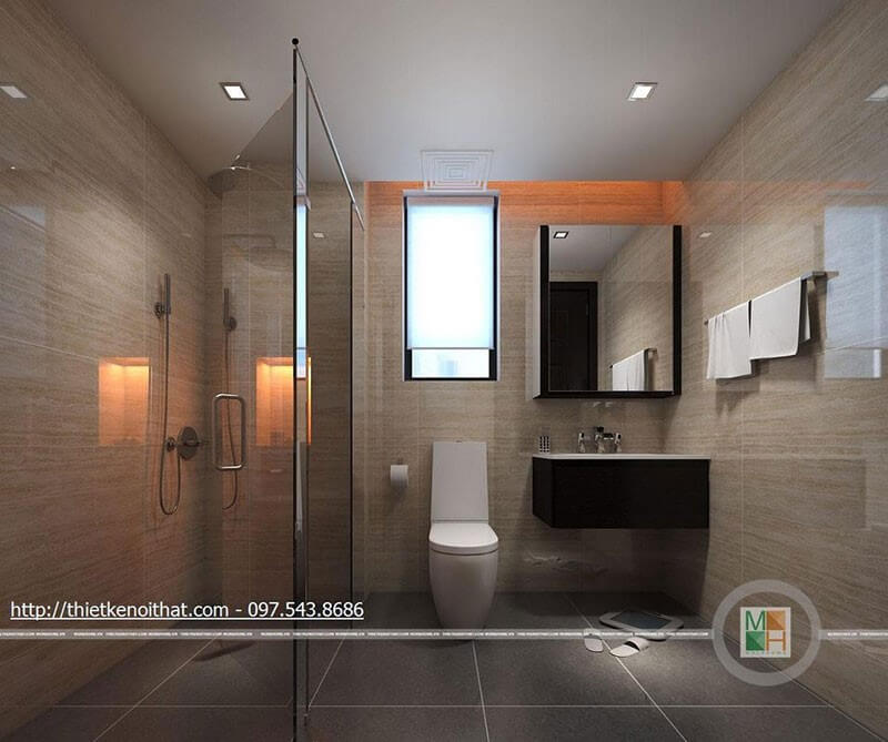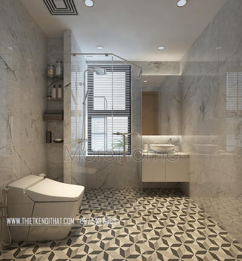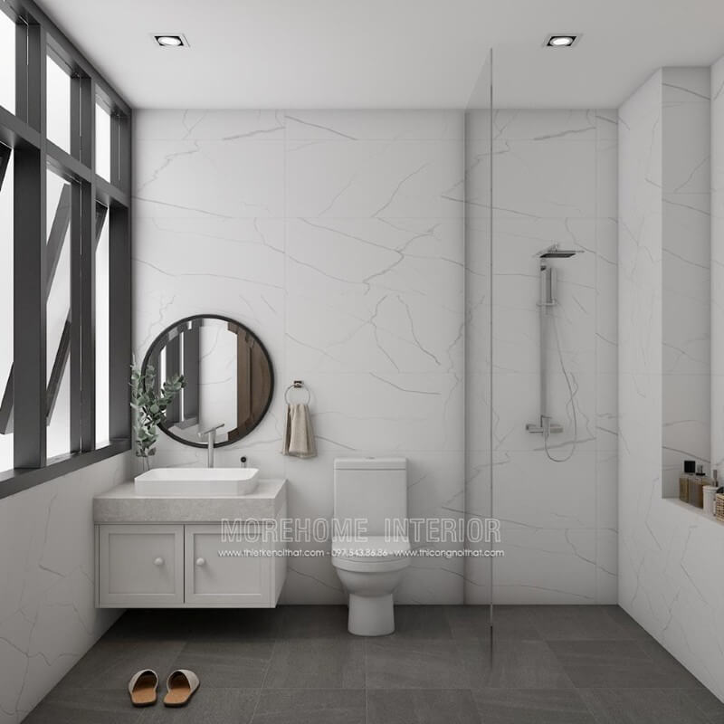 Thiết kế phòng tắm hiện đại với lựa chọn gách ốp tường và nền mang lại sự thoáng mát và sạch sẽ