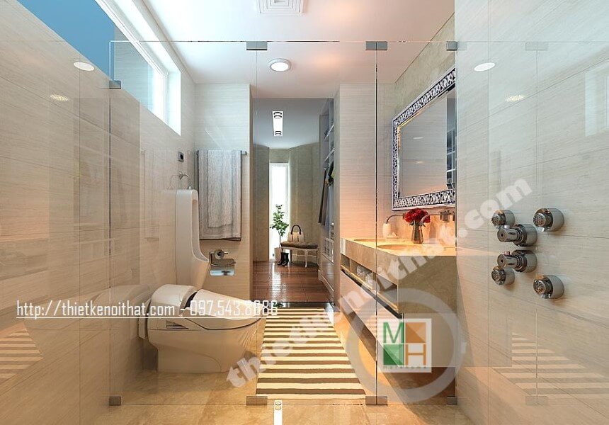 Thiết kế phòng tắm với nội thất nhẹ từ đá, kính cường lực tạo nên không gian thoáng mát và rộng rãi hơn