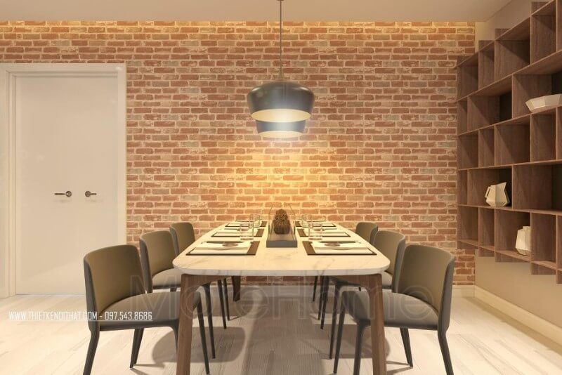 Trang trí không gian phòng ăn với giấy dán tường giả gạch màu đỏ, những bức tường thô cứng trở nên mềm mại và vô cùng ấn tượng