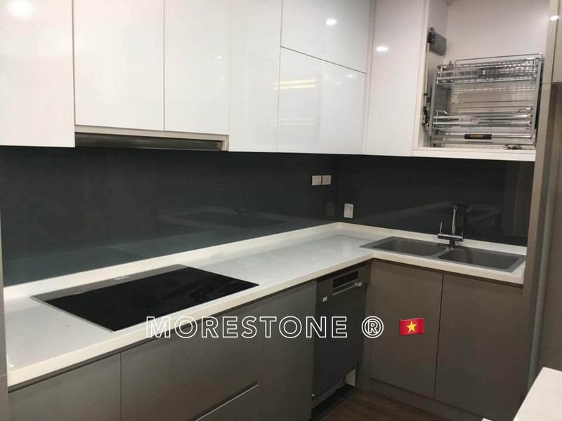 Ấn tượng với mẫu nội thất bếp cao cấp sang trọng đá Himacs ốp bếp màu trắng tinh khôi, thể hiện sự sang trọng và tiện nghi cho nhà phố, chung cư, biệt thự.