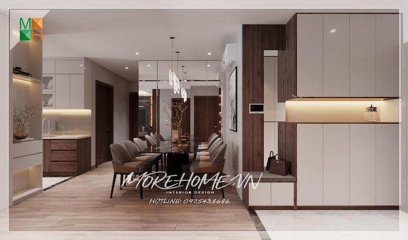 Bàn ăn kiểu hiện đại (Modern): Mẫu bàn ăn này có thiết kế tối giản, đường nét sắc nét và sử dụng chất liệu đa dạng như gỗ công nghiệp, kính, kim loại, đá, v.v., phù hợp với không gian phòng ăn hiện đại.