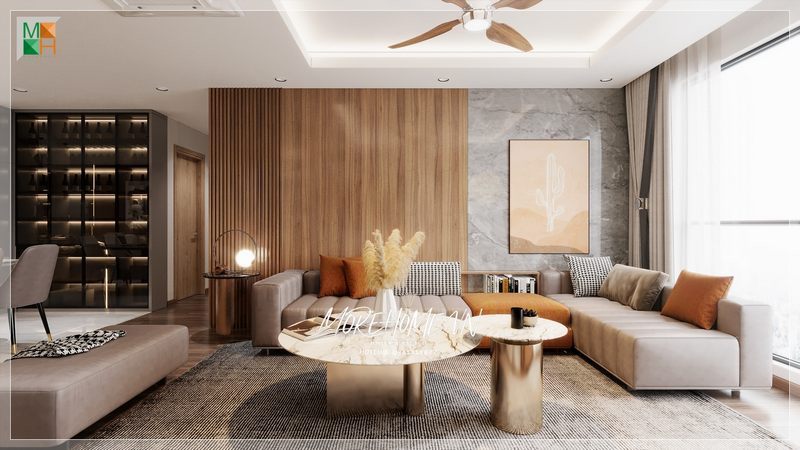 Sự kết hợp tài tình giữa bàn trà và bộ sofa giúp phòng khách nổi bật hơn