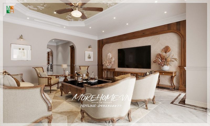 Nội thất phòng khách từ gỗ óc chó tự nhiên được thiết kế theo phong cách tân cổ điển sang trọng, phù hợp với các căn hộ, biệt thự, nhà phố.