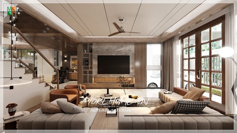 Trong thiết kế nội thất phòng khách biệt thự tân cổ điển, khéo léo được thể hiện qua những chạm khắc tinh xảo của trần nhà, kệ TV gỗ tự nhiên, vách tường của TV, lựa chọn rèm cửa và đèn chùm treo trần, tất cả đều được thiết kế tinh tế và điêu luyện.