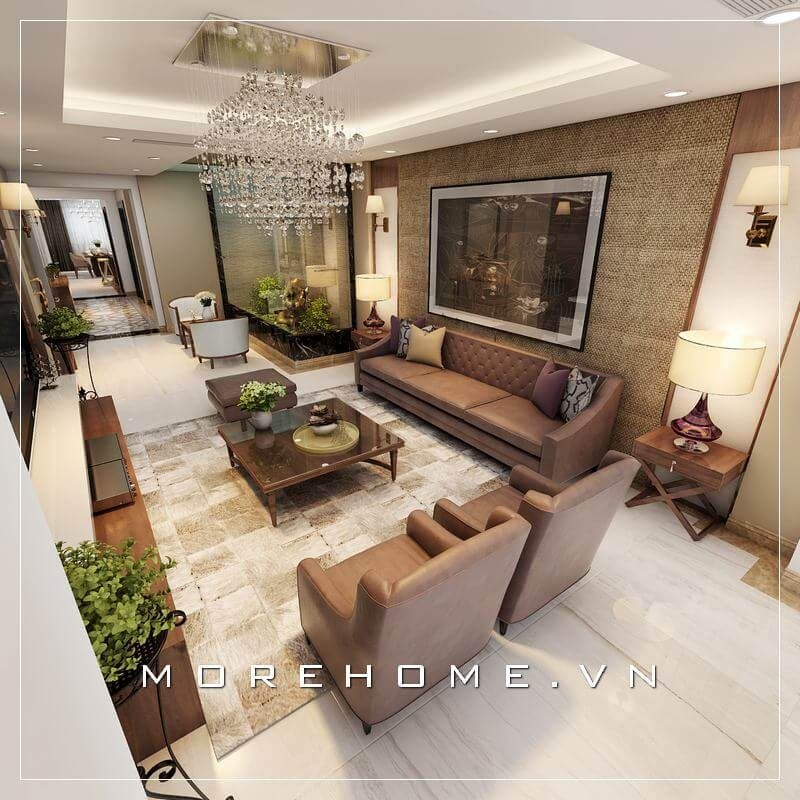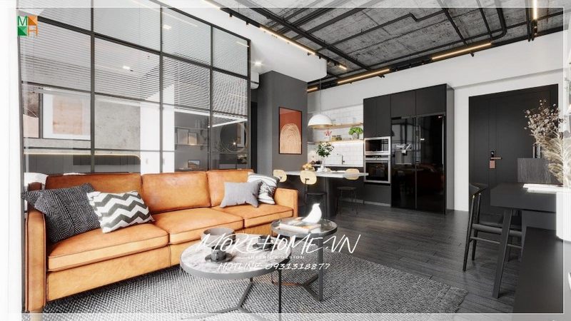 Phòng khách căn hộ được ngăn cách với các phòng khác của hộ bằng lớp kính vách ngăn trong suốt tạo độ thoáng cho chung cư