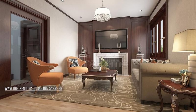 Sofa phòng khách biệt thự được thiết kế theo phong cách tân cổ điển với sự kết hợp giữa gỗ tự nhiên và nhịp nhàng, tạo nên hiệu ứng đẹp mắt.
