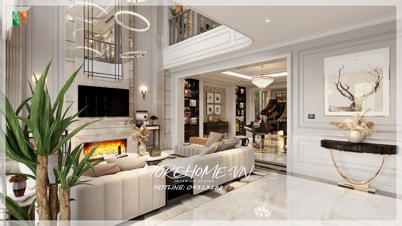. Ghế sofa phòng khách của biệt thự cao cấp được bố trí theo hình chữ U, tạo nên một ấn tượng sâu sắc. Thiết kế hiện đại, kết hợp với các tone màu trung tính giúp tạo nên một cảm giác sang trọng và tinh tế.