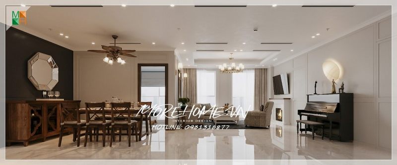 Mẫu thiết kế nội thất chung cư đẹp, tiện nghi với tông màu chủ đạo là trắng và được ghi xẫm.