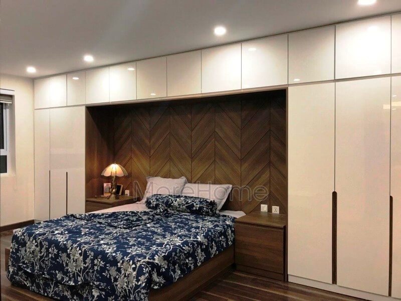 Hình ảnh thể hiện công việc thi công nội thất phòng ngủ hiện đại với sử dụng gỗ công nghiệp tại căn hộ chung cư Thăng Long Number One Hà Nội được thực hiện bởi Morehome - một đơn vị thi công trực tiếp.