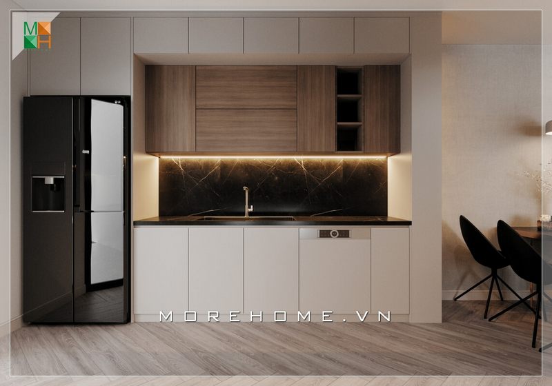 Mẫu tủ bếp gỗ công nghiệp tone màu nâu - trắng với thiết kế đơn giản, cùng với mặt bếp ốp đá cao cấp và các thiết bị phòng bếp hiện đại sẽ giúp tạo nên sự tiện nghi cho người nội trợ.
